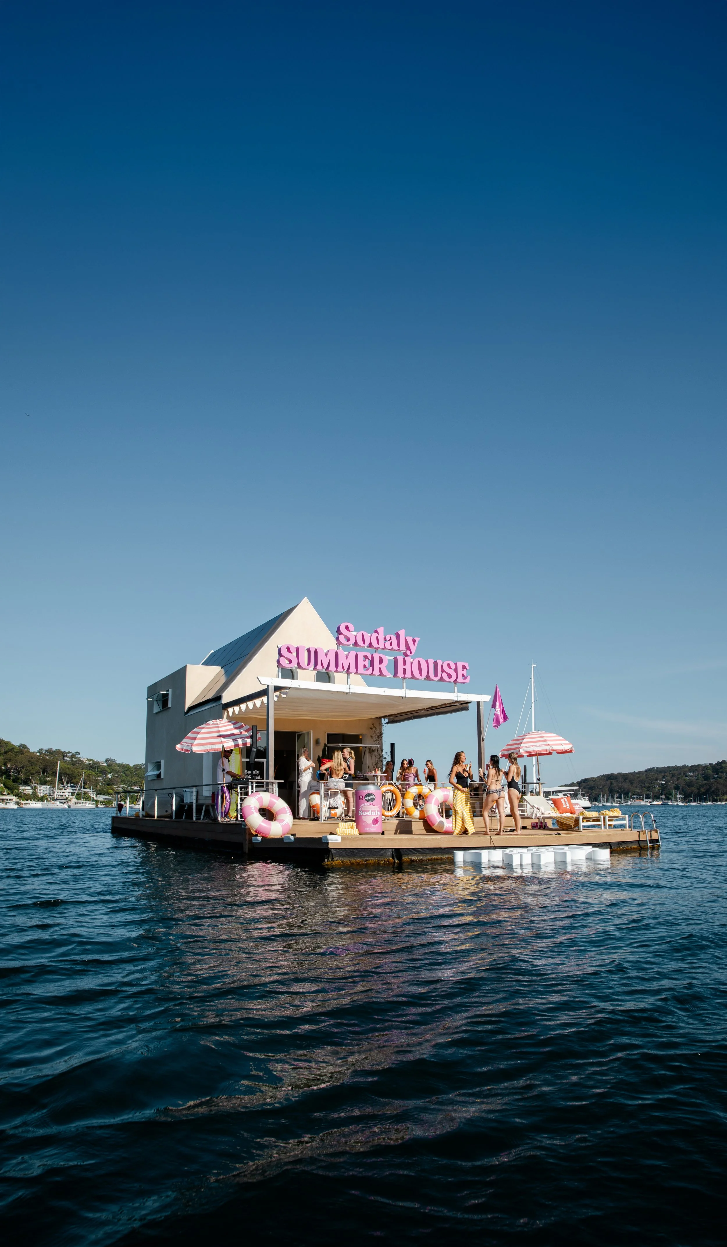 The already beautiful houseboat was styled with playful, branded touches — including a custom house sign, floating letters, a Sodaly can esky, surfboard, pool buoys, umbrellas, colourful eskies, cushions, and towels.